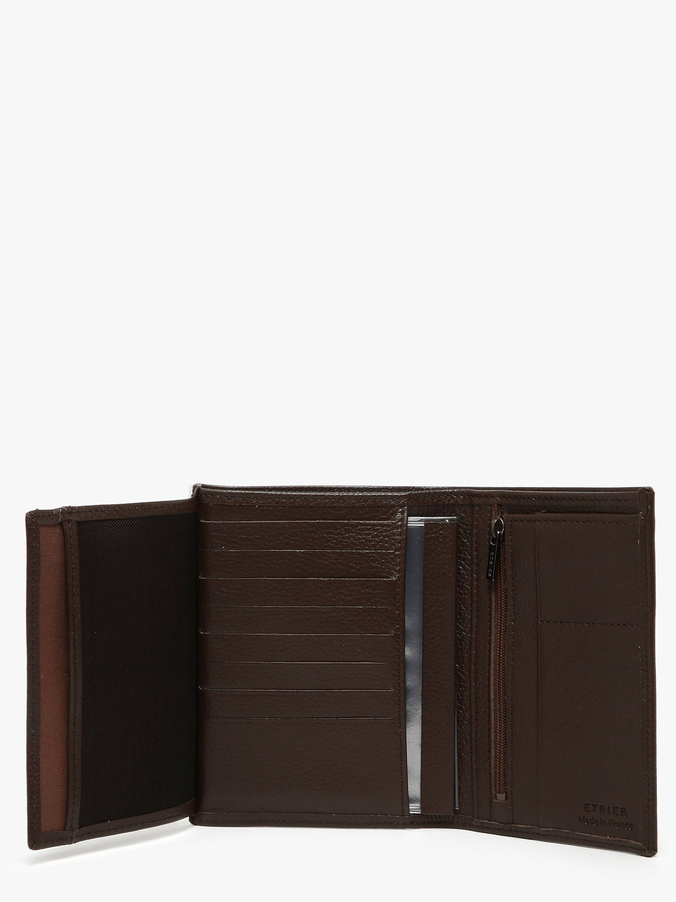 Le portefeuille Madras signé Etrier marie utilité, élégance et savoir?faire. Confectionné en cuir de vachette véritable et fabriqué en France, il se distingue par sa finition soignée, sa robustesse et son esthétique raffinée — un accessoire sur lequel vous pouvez compter au quotidien. Pensé pour accueillir tous vos essentiels, il propose dix emplacements pour cartes bancaires, quatre poches simples, une poche pour billets, une poche zippée et une poche transparente — pratique pour une pièce d’identité ou un permis. À l’extérieur, ce portefeuille dévoile une poche ouverte sur toute la longueur pour vos billets. Une fois ouvert, l’aménagement intérieur se répartit intelligemment : la face centrale est dotée de huit fentes horizontales pour cartes et d’un compartiment vertical adapté à un format type permis ou carte d’identité, tandis que la face latérale offre un espace zippé vertical et deux poches ouvertes verticales pour cartes, reçus ou tickets. Le drapeau français cousu, ainsi que le logo Etrier en métal embossé ""Made in France"", soulignent l’authenticité et l’origine française du produit.