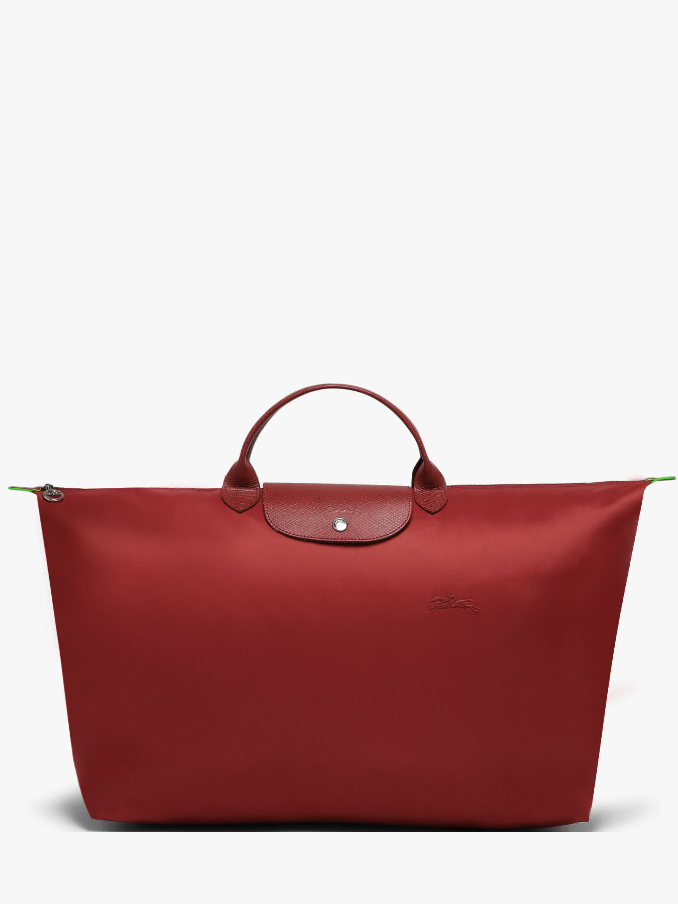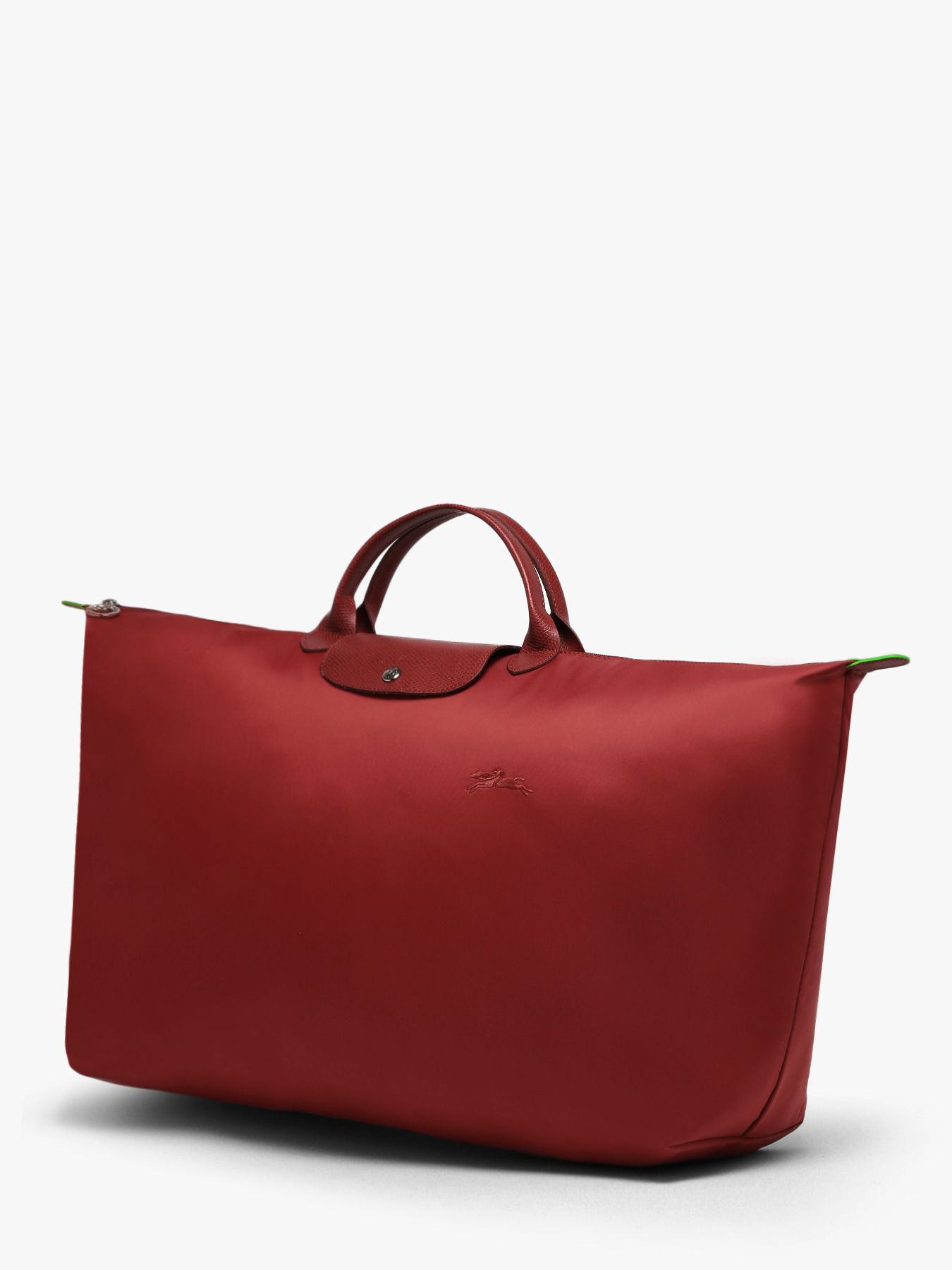 Ce sac de voyage Le Pliage Green de chez Longchamp se ferme à l'aide d'un zip et se porte à la main grâce à ses deux petites anses.